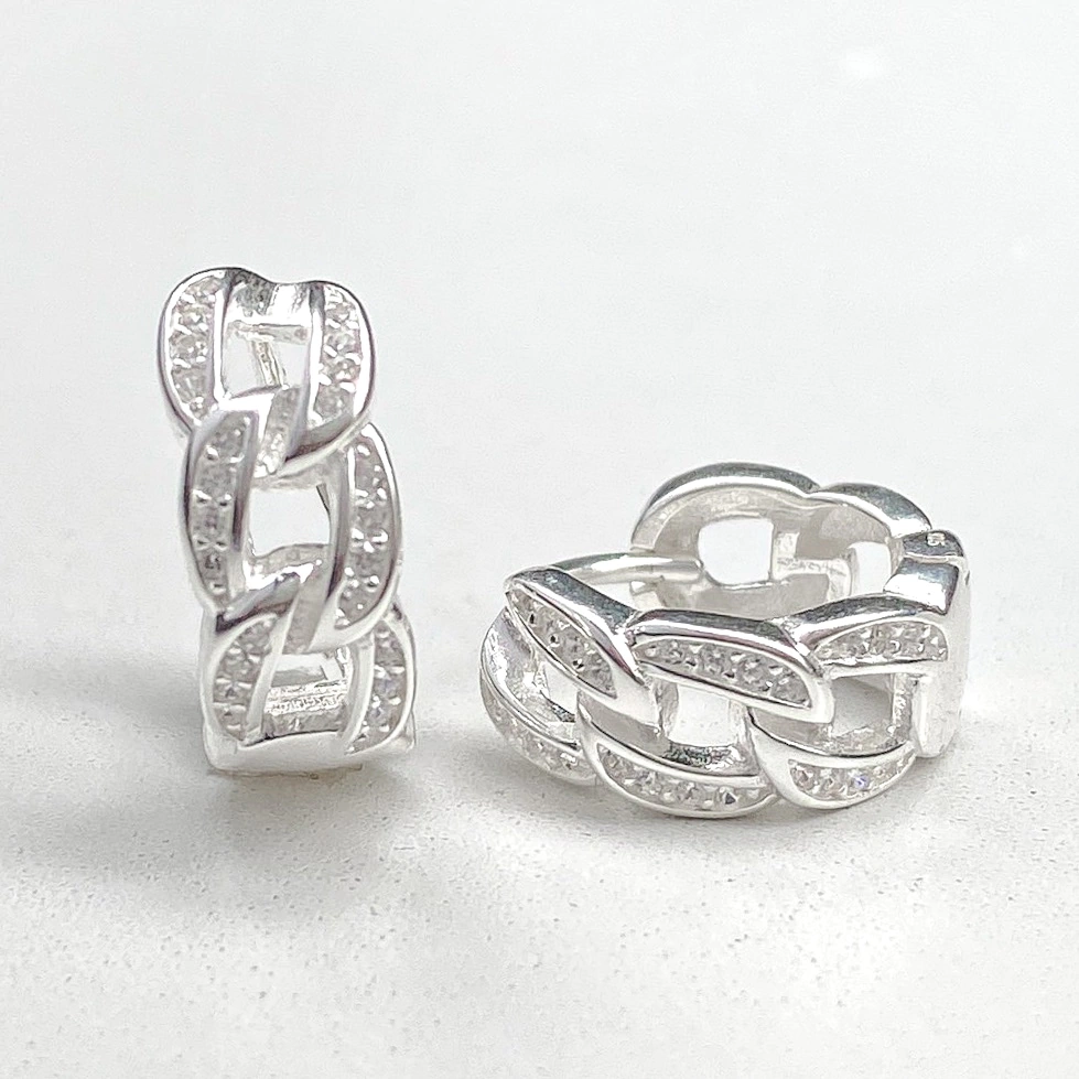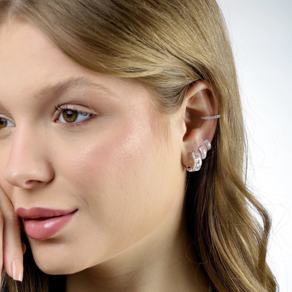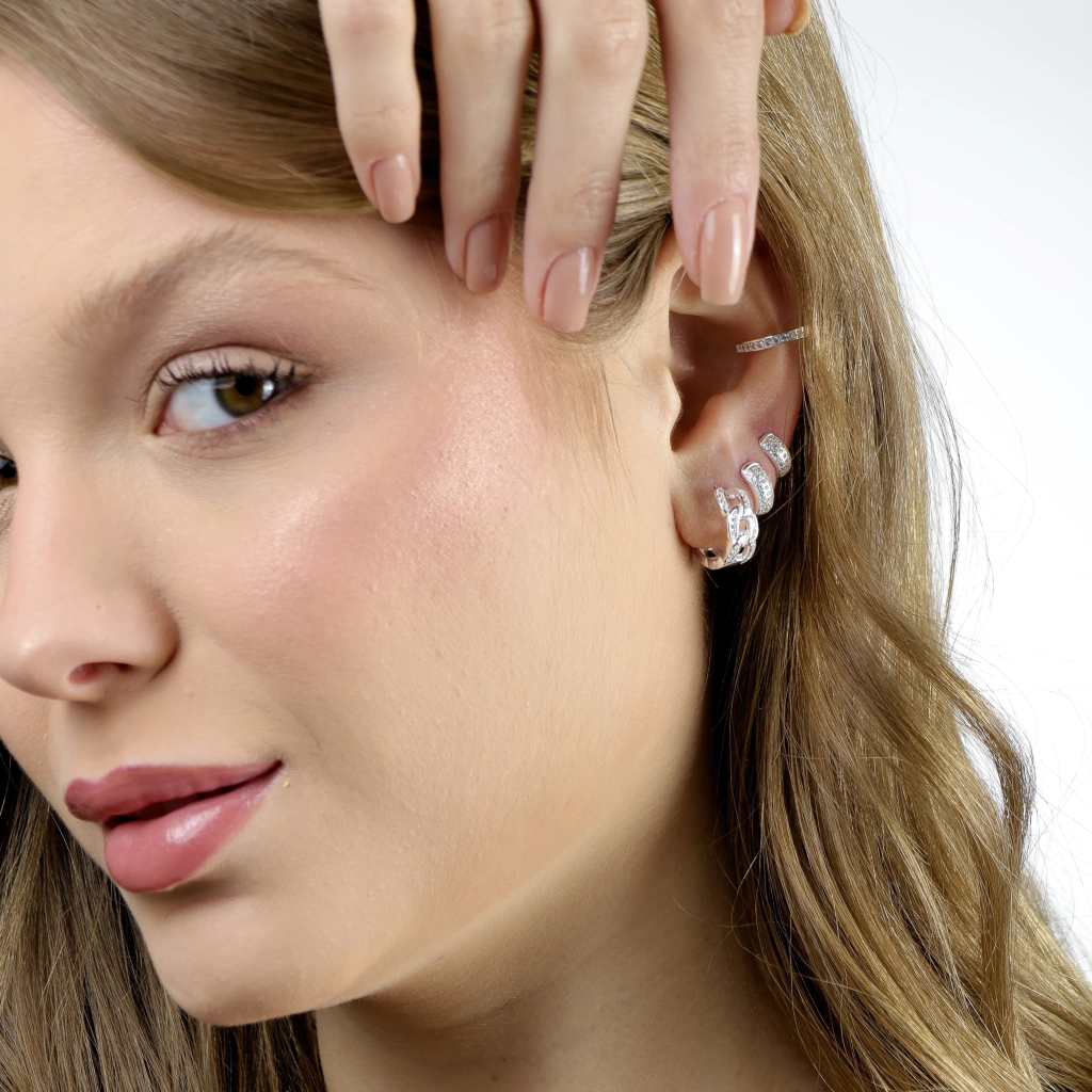 Esta argola exala sofisticação e charme, combinando o brilho intenso da prata com o brilho sutil dos cristais cravejados ao longo da argola, criando uma harmonia perfeita entre o design moderno e a beleza clássica.